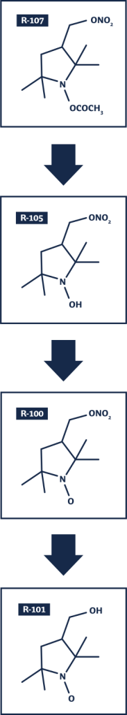 As shown in the schematic, R-107 is hydrolyzed to form the intermediate R-105 (3-nitratoproxyl-hydroxylamine). R-105 subsequently oxidizes to form R-100, the active payload molecule serving as: (a) a nitric oxide (“NO”) donor via its organic nitrate (to form the denitrated entity hydroxymethylproxyl (R-101), and (b) a broad-spectrum catalyst of reactive oxygen species (“ROS”) degradation via its nitroxide moiety.